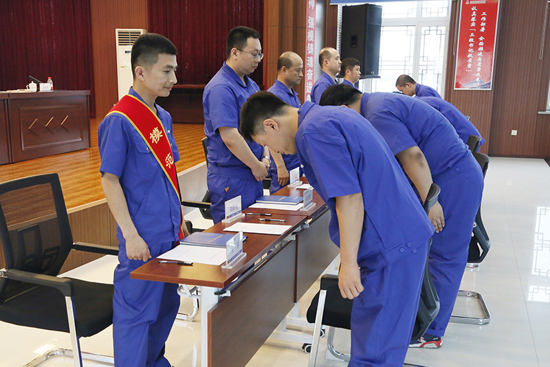儀式上,結對師徒鄭重地在師徒協議上簽字,徒弟向師傅鞠躬行拜師禮,師傅向徒弟贈送學習筆記本并寄語鼓勵。