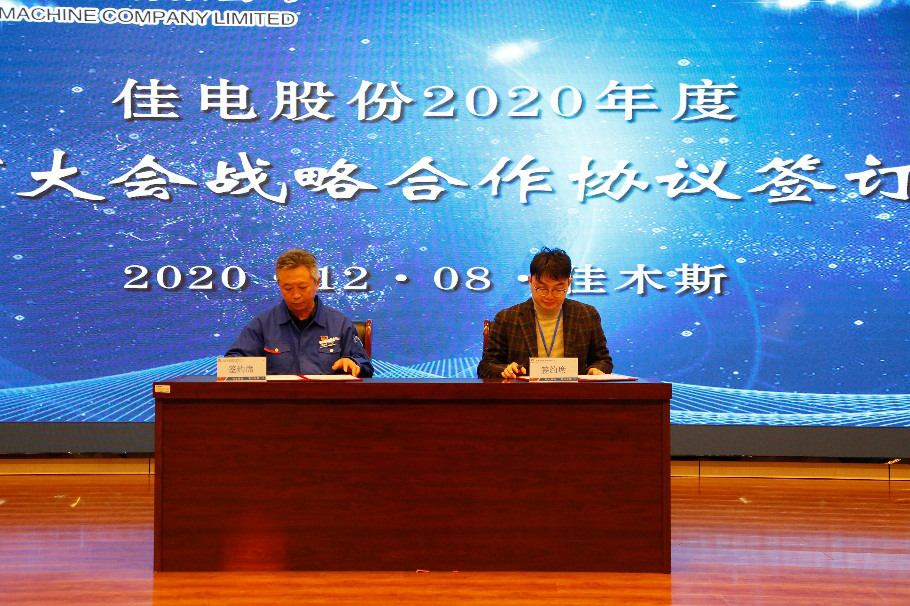 姜清海代表佳電股份與杭州華光、遼寧東港、申科股份三家戰(zhàn)略供應(yīng)商代表簽訂戰(zhàn)略合作協(xié)議。